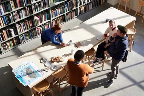 This beautiful building with full height windows and lots of natural light required a simple clean interior design with natural finishes that would ensure the Books were the main star and that the space and the furniture would only compliment them.